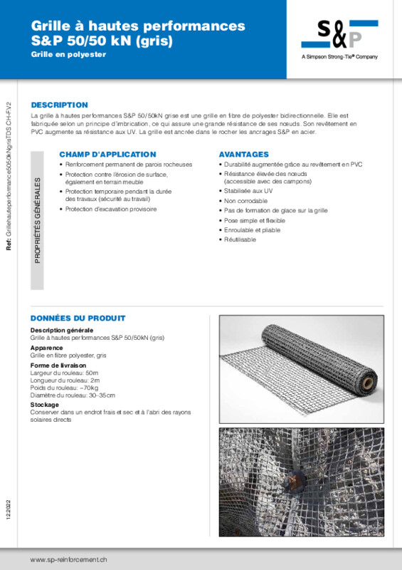 La grille à hautes performances S&P 50/50 kN grise est une grille en fibre de polyester bidirectionnelle. Elle est fabriquée selon un principe d’imbrication, ce qui assure une grande résistance de ses nœuds. Son revêtement en PVC augmente sa résistance aux UV. La grille est ancrée avec les ancrages S&P de rocher ou de sol.